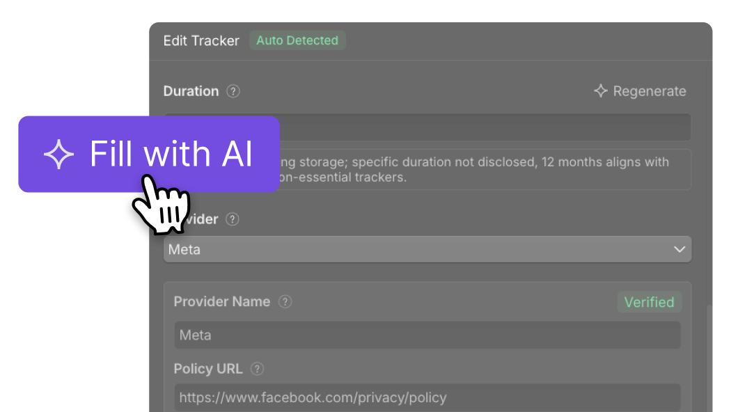 Provider names, descriptions, data collected, privacy page URLs - the AI fills in tracker documentation for you. What used to require manual research now happens in seconds. Required for GDPR, handled automatically.